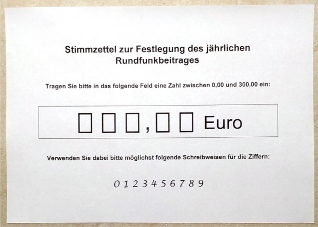 Bei der Erstabstimmung aber ist die Minimalzahl 0 Euro, d.h., Abschaffung des ÖR, und die Maximalzahl 250 Euro, also ein gutes Stück über der aktuellen Zahl. Der Maximalwert wird nicht auf 999 Euro o.ä. festgelegt, da der ÖR eine solche Zahl ohnehin nicht innerhalb eines Jahres würde bewältigen können.
