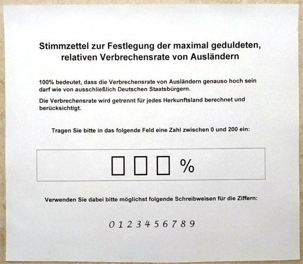 (Anm.: Die Untergrenze von 0 im Stimmzettel (=Ausweisung aller Krimineller) bedürfte einer ausführlichen Debatte und einer eigenen, expliziten Festlegung; dies ist aber nicht Thema dieser Abhandlung. Ich halte diese Untergrenze für zu klein, zu extrem.)