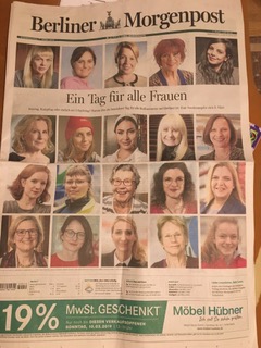 Ein weiterer Schock erwartete Lena, als sie gestern an einem Zeitungsständer vorbeikam. Da lag die Berliner Morgenpost mit einer Titelseite, auf der einzig und allein Portraits von Frauen abgebildet waren. Überschrift: „Ein Tag für alle Frauen“. Lenas erster Gedanke: „Das ist ja wie früher die Prawda“. Die Assoziation ist zwar leicht schief – die Prawda hatte kaum Bilder und schon gar keine farbigen – aber in der Sache nachvollziehbar.
