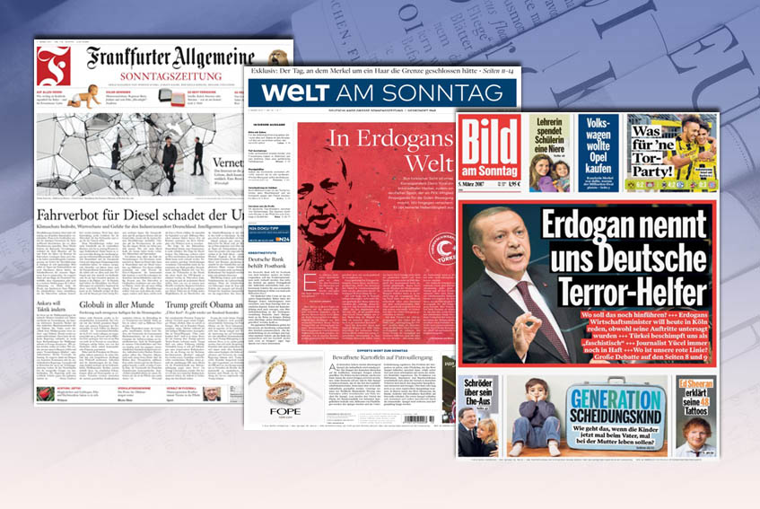 Die WeLT AM SONNTAG setzt ein intelligentes Stilmittel ein. Sie markiert alle Beiträge quer durchs Heft, die sich mit der Türkei befassen – und das tut eine beträchtliche Zahl in nahezu allen Sparten – mit einem Bildsignal. Unterschiedlich deutlich zieht sich durch alle Türkei-Texte die identische Botschaft: das war’s. Österreichs Bundeskanzler Christian Kern sagt in seinem Interview „Die Türkei hat den RUBIKON überschritten“, sein Land wünsche sich den Schutz der EU-Außengrenzen in europäischen Händen, solange es den aber nicht gebe, werde Österreich mit seinen Nachbarn weiter zusammen handeln. Die „Geschichte einer ENTFREMDUNG“ schildert den Weg in der Sackgasse vom EU-Beitritt der Türkei – nicht zuletzt den mehrfachen Wechsel in Merkels Rolle. „Baumeister mit ABRISSBIRNE“ resümiert: