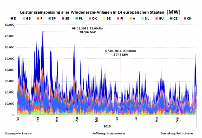 Die sicher zur Verfügung stehende elektrische Leistung aus Windkraftanlagen ist unwesentlich größer als null. Dass eine Glättung selbst über Jahreszeiträume nicht eintritt, zeigt die Windstromproduktion des Jahres 2016, die trotz eines Zubaus an installierter Leistung von 4.970 Megawatt deutlich unter der von 2015 lag (77,4 zu 79,2 Terawattstunden). Der Wettergott ist kein Grüner.