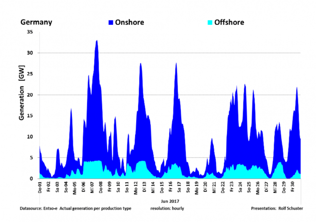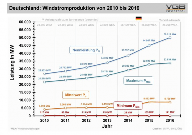 Er weht sogar ziemlich exakt in der gleichen Weise wie der Wind an Land. Der Unterschied besteht darin, dass der Seewind kräftiger weht und daher die Volllaststunden der Anlagen auf See höher sind (ca. 3.800 Stunden pro Jahr) gegenüber Anlagen an Land (ca. 2.200 Stunden pro Jahr in Schleswig-Holstein, 1.000 in Bayern). Stunden und Tage mit Schwachwind und Flaute gibt es aber auch hier. Trotz einer Fast-Verdopplung der installierten Windleistung seit 2010 auf 50.019 Megawatt im Jahr 2016 liegen die Leistungsminima unverändert im sehr niedrigen Bereich: