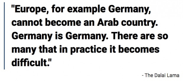 Und als wäre es damit noch nicht genug der Kritik an den blauäugigen Immigrationsbefürwortern, setzte Tensin Gyatso, wie der Dalai Lama mit Geburtsnamen heißt, noch einen drauf. „Ich denke, Europa gehört den Europäern!“ stellte er fest und zielte mit Blick auf ein Land, das ihm offenbar besonders am Herzen liegt, auf seine frühere Gastgeberin: „Beispielsweise Deutschland kann kein arabisches Land werden. Deutschland ist Deutschland! Es sind zu viele, als dass es in der Praxis funktionieren könnte.“