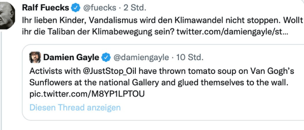 Der altgrüne Ralf Fücks, einst führendes Mitglied des maoistischen „Kommunistischen Bund Westdeutschland“ (KBW), heute Leiter eines „Zentrum Liberale Moderne“, reagierte via Twitter: „Ihr lieben Kinder, Vandalismus wird den Klimawandel nicht stoppen. Wollt ihr die Taliban der Klimabewegung sein?“.