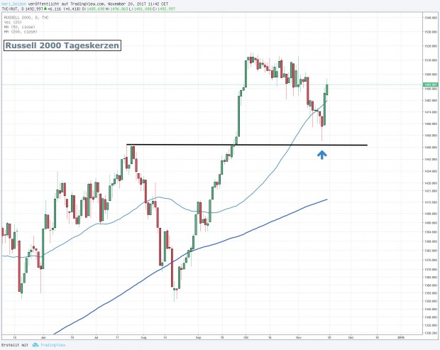 Während es hier politisch unsicherer wird, stehen die Anzeichen für die US Indizes aber zum Jahresende weiter klar auf Grün, besonders schön kann man das am breiten Nebenwerte-Index Russell 2000 sehen, der eine wunderbare Konsolidierung vollzogen hat, die bullisch zu werten ist: