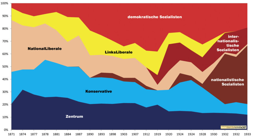 Man sieht deutlich, daß die Sozialdemokratie seit der Reichsgründung insbesondere auf Kosten der Nationalliberalen von einer Splitterpartei zur Massenbewegung aufstieg, während diese im umgekehrten Trend marginalisiert wurden.