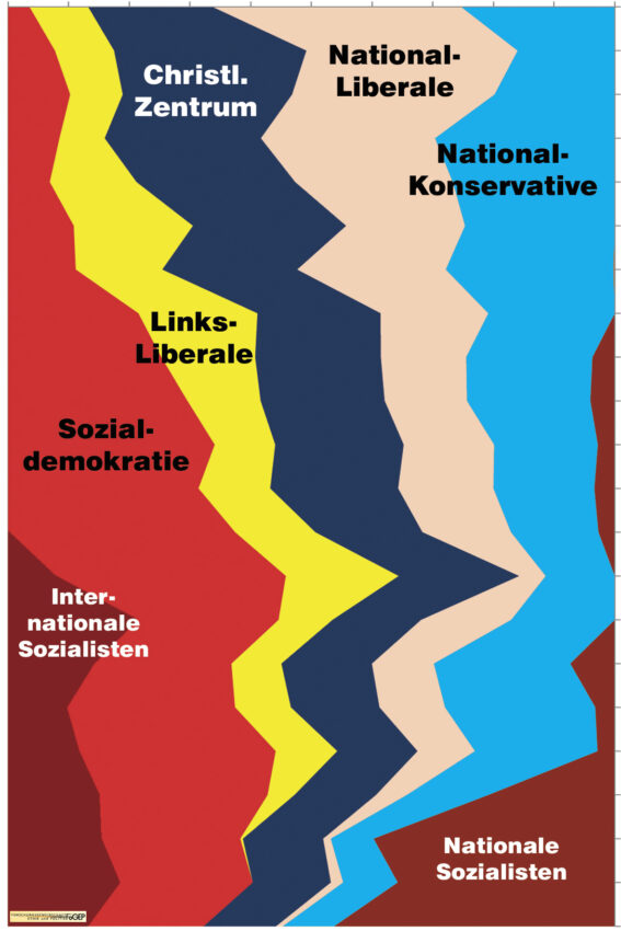 Bei dieser Darstellung ist das „Zentrum“ weitgehend stabil. Die SPD manifestiert sich ebenfalls als fester Bock. Doch auch die Nationalkonservativen bleiben – grafisch angelehnt an das „Zentrum“ – trotz wiederholter Verluste bis auf den Zeitraum 1928 bis 1933 relativ konstant. Die tatsächlich systemrelevanten Veränderungen finden in der grafischen Mitte statt:
