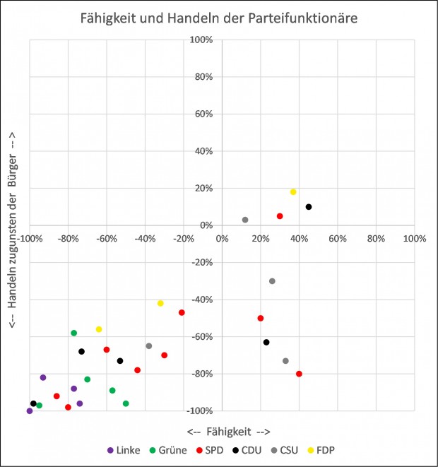 In diesem Diagramm sind auf der X-Achse die Fähigkeiten der Parteifunktionäre aufgetragen, den Aufgaben gerecht zu werden, die sie haben, und in der Vertikalen das tatsächliche Handeln im Sinne der Bürger, es handelt sich hierbei um meine Einschätzungen. Es sind zwar einige Parteien-abhängige Unterschiede erkennbar, aber im Mittel muss festgestellt werden, dass die Fähigkeiten in keiner Weise ausreichen, um die Aufgaben zu erfüllen, sie sind überwiegend unter 0%. Ein Wert unter 0% bedeutet, dass die Fähigkeiten so gering sind, dass den Bürgern fast zwangsläufig ein Schaden entsteht. Eine +10% beim Handeln bedeutet, dass den Bürgern immerhin noch ein Nutzen von 10% entsteht.