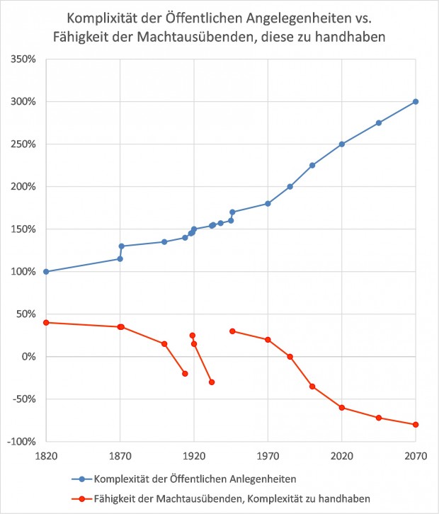 Dieses Diagramm zeigt die Komplexität der Öffentlichen Angelegenheiten im Zeitablauf (meine Einschätzung). Die Erhöhung beruht auf einer zunehmenden Anzahl von Themenkreisen im Laufe der Zeit, auf einer zunehmenden Größe des Territoriums, auf einer zunehmenden Zahl von relevanten Playern und Menschen weltweit. Seit 1820 gibt es z.B. folgende neue Themenkreise / Domänen: Zunehmend mehr Technik und Wissenschaft, Sozialversicherungen, Papiergeldsystem, zunehmende Zahl von Menschen weltweit, Umweltthematik, Klimathematik, zunehmende Überalterung, Digitalisierung / Automatisierung durch Computer, zunehmende Migration etc.