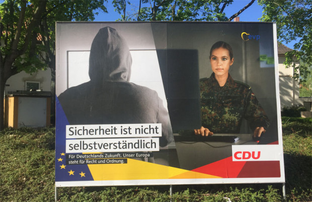 Für den EU-Wahlkampf plakatiert die CDU jetzt den Slogan: „Sicherheit ist nicht selbstverständlich“ und: „Für Deutschlands Zukunft. Unser Europa steht für Recht und Ordnung.“