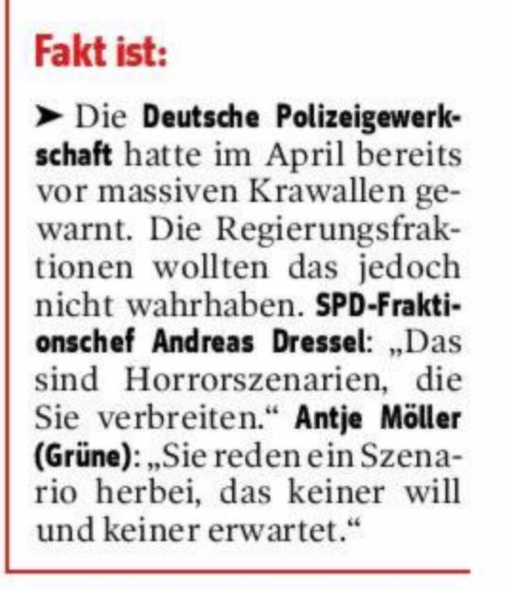 Nun müssen auch nicht angeschlagene Merkels und Scholzens opportunistisch schnell noch mal eben eine Lanze für die Polizei brechen. Das ist unglaubwürdig, und ihre kurzen Statements, dass die Bösen unter den Demonstranten mit der Härte des Gesetzes verfolgt werden müssten, sind wertlos.