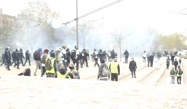 Der Mann sitzt blutüberströmt am Boden, um ihn herum Sicherheitskräfte. Filmen dürfen wir ihn nicht, da hilft auch kein Presseausweis. Die Polizisten lassen uns nicht durch. Der Mann in den Dreißigern ist mit einem Schlagstock malträtiert worden, die Bilder könnten falsche Assoziationen wecken. Überhaupt war die Demonstration der Gelbwesten an diesem Nachmittag des 21. Aktes der Gelbwesten-Proteste in Lyon von Gewalt überschattet. Von Anfang an haben die Sicherheitskräfte versucht, die Demonstration aufzulösen und die gut 1.000 Teilnehmer mit Tränengas und Knüppeln auseinander zu treiben. Es sieht nach einem Strategiewechsel aus, offenbar soll es gar nicht erst dazu kommen, dass sich eine geschlossene Kundgebung bildet. Das ist gelungen. Der Demonstrationszug konnte sich zunächst erst gar nicht bilden, und wenn sich dann doch mehrere Grüppchen zusammengefunden hatten, ging umgehend die Polizei dazwischen, um die Demonstration wieder aufzulösen.