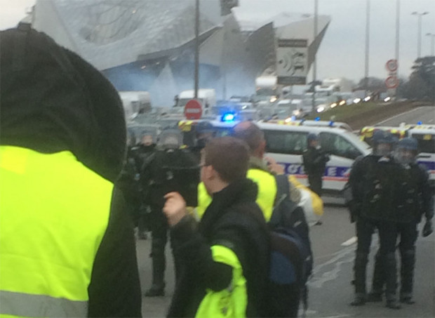 Sie hupen, sie diskutieren mit den Gelbwesten, bekunden Solidarität. Auch ein Deutscher hat sich hierher verirrt mit seinem Luxusfahrzeug. Ein Rolls Royce. Die Scheiben hat er geschlossen. Die “Route du Soleil“ ist blockiert. Eine Stunde lang. Aber selbst die Gendarmes halten sich zurück, von Aggression keine Spur. Dabei hatte es kurz zuvor noch einen Zwischenfall gegeben. In der Stadtmitte, kurz vor der Altstadt, kurz vor “Vieux Lyon”. Da flogen die ersten Tränengasgranaten. Danach blieb es ruhig auf dem Weg zur Autobahn. Die Gelbwesten marschieren. Jeden Samstag. Wenn man mitgeht, muss man sich auf mindestens fünf bis acht Kilometer Fußmarsch gefasst machen. Am Abend, gegen 18 Uhr, wie an jedem Wochenende, versinkt der zentrale Platz Lyons, die Place Bellecour, in einer Tränengaswolke. Das ist wie in Paris. Die Ordnungskräfte wollen die Kundgebung auflösen. Das machen sie um diese Zeit immer mit ihrem “gaz lacrymogène”. Man gewöhnt sich an den Husten, die brennenden Augen. Auch am nächsten Tag kribbelt es noch um den Mund.