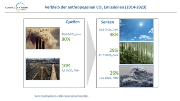 Das ist aber eine völlig unzureichende Betrachtungsweise. Wie wir dem Global Carbon Project entnehmen können, beträgt die Senke durch Ozeane 10,4 Milliarden Tonnen und die Senke durch Pflanzen 11,7 Milliarden Tonnen, zusammen also 22,1 Milliarden Tonnen CO2. Berechnet man den Anteil Deutschlands daran (0,84 Prozent der Weltbevölkerung), so ist der auf Deutschland entfallende Anteil der globalen Senken etwa 190 Millionen Tonnen CO2. Das entspräche ungefähr der heutigen CO2-Emission von Haushalten und dem Verkehr, den Sektoren, in denen eine CO2-Vermeidung sich am schwierigsten gestaltet. Die Energiewirtschaft ist mit 200 Millionen Tonnen CO2 der bedeutsamste; ließe sich aber am ehesten gegen Null bringen. Wenn das auf wirtschaftliche Weise gelingen soll, bedarf es neben den bereits vorhandenen erneuerbaren Energien des Wiedereinstiegs in die Kernenergie und der Anwendung von CO2-Abscheidung (CCS) bei Kohlekraftwerken.