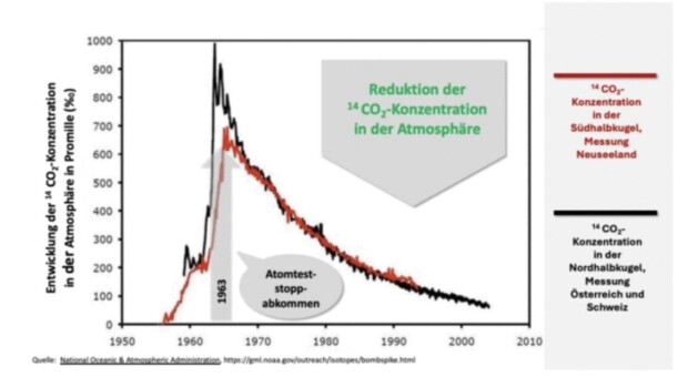 Durch Atombombentests nach dem 2. Weltkrieg wurden erhebliche Mengen C14-haltigen CO2 gebildet. Wie man der nächsten Grafik entnehmen kann, war nach 12 bis 15 Jahren nach Ende der Atombombentests die Hälfte des C14-CO2 von Ozeanen und Pflanzen aufgenommen worden, sodass wir heute fast auf das Niveau vor den Atombombenversuchen zurückgekommen sind. Die Halbwertszeit ist in Wirklichkeit etwas länger als 12 bis 15 Jahre, nämlich 30 bis 40 Jahre (wie auf anderem Wege berechnet), weil durch das Verbrennen von Kohle und Öl, die äußerst wenig C14-CO2 aufweisen, die C14-Konzentration in der Atmosphäre zusätzlich verdünnt worden ist.