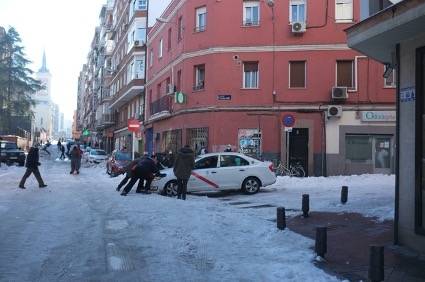 Am Wochenende hatten sich Bürger mit ihren Geländewagen spontan bereit erklärt, Notleidende aus der Nachbarschaft ins Krankenhaus zu fahren – eine enorme Verantwortung. Die Feuerwehr fiel wegen der nicht freien Straβen am Freitag und Samstag des vergangenen Wochenendes fast komplett aus. Das Militär tauchte erst am Montag in Madrid auf, geschickt von der Verteidigungsministerin. Sie schippten unter anderem Schnee vor dem Krankenhaus „Gregorio Marañon“. Schaulustige und Fernsehkameras sind schnell zur Stelle, um das einmalige Bild festzuhalten. An Winterreifen und Schneeketten fehlt es immer noch überall. Alle bleiben stecken, auch die Taxis.