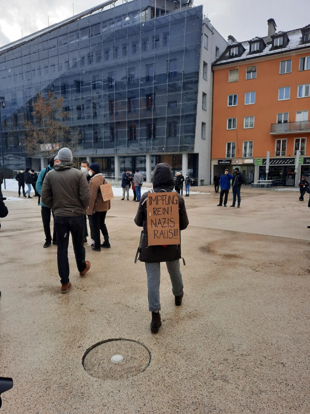 Die Plakate und Slogans waren dementsprechend: „Impfung rein. Nazis raus.“ Wer nicht die Meinung der „Linken“ teilt, ist automatisch ein Nazi. Wahrlich gelebte Toleranz. Das einzig Positive an der Demonstration war die Zahl der Teilnehmer. Das „breite Netzwerk“ brachte etwa 50 Demonstranten auf die Straße. Die Tiroler Tageszeitung machte daraus mit einem sehr geschickt gewählten Foto 200 Teilnehmer.