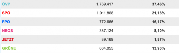 Sebastian Kurz hat mit 129.532 mehr Vorzugsstimmen als alle anderen Parteichefs zusammen; Herbert Kickl, FPÖ, 58.158 Stimmen; Norbert Hofer, FPÖ, 23.620; Werner Kogler, Grüne, 16.086; Pamela Rendi-Wagner 12.911; Beate Meinl-Reisinger, Neos, 8.576 Stimmen.