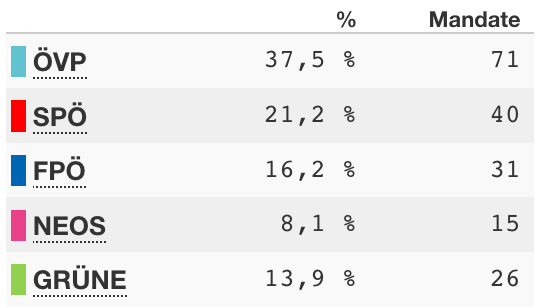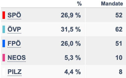 Um die aktuellen Umfragedaten einzuordnen, lohnt der Blick auf die letzten zwei Nationalratswahlen (erst 2019, dann 2017; Quelle Innenministerium Österreich):