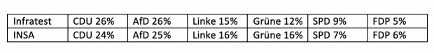Gut zwei Monate vor der Landtagswahl liegen dort laut einer aktuellen MDR-Umfrage von Infratest dimap CDU und AfD mit jeweils 26 Prozent gleichauf. Bei den Erfurter Meinungsforschern von INSA führt die AfD sogar vor der CDU mit 25 zu 24 Prozent. INSA-Chef Hermann Binkert erklärt den Unions-Erdrutsch wie folgt: „Die CDU hat zuerst ihre Stammwähler verloren. Jetzt verliert sie auch noch die Wechselwähler.“ Zudem demobilisiere die große Unzufriedenheit mit der GroKo im Bund obendrein frühere CDU-Anhänger, analysiert Binkert. Sie bleiben jetzt einfach zu Hause. So geschehen jüngst auch im Westen bei der Landratswahl im Osnabrücker Land, wo eine Grüne den CDU-Titelverteidiger in seiner Hochburg schlug.