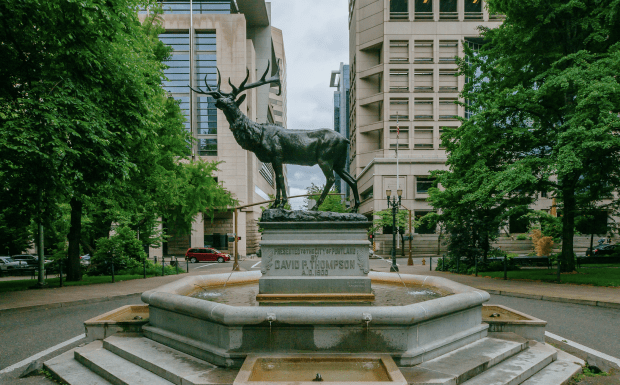 Das Problem dieses eindrucksvollen Tieres: Es ist als „Thompson-Elk“ von David Preston Thompson in Auftrag gegeben worden und war mit einer Tafel ausgestattet, die den Auftraggeber als Spender ausweist. Der in Ohio geborene Thompson kam 1853 im Alter von 19 Jahren nach Oregon. Dort wurde er zum erfolgreichen Geschäftsmann und Politiker. Von 1881 bis 1885 war er Bürgermeister Portlands, kandidierte erfolglos zum Gouverneur des jungen Bundesstaats, erwarb sich jedoch hohes Ansehen vor allem bei der Erschließung des Nordwestens der USA über seine Mitwirkung am Bau der Oregon Rail, die die Region am Pazifik an die damaligen Zentren der Ostküste anband.