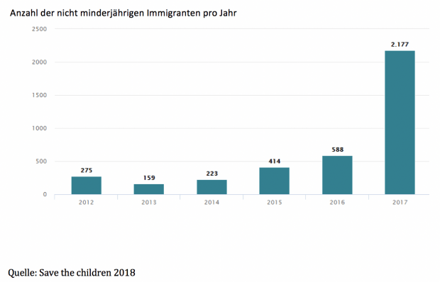„…es wächst auch die Zahl der Minderjährigen, die illegal ins Land einreisen. Hier vor allem über den Seeweg. Wie ein Bericht von „Save the children“ zeigt, ist die Zahl im vergangenen Jahr von rund 600 auf knapp 2.200 in die Höhe geschossen.“