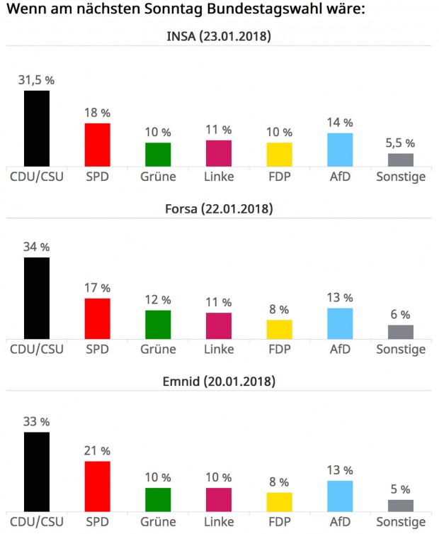 Ob sich die SPD für oder gegen eine kleine GroKo entscheidet, kann es – gemessen an weiteren Umfragen – immer nur noch schlechter machen. Dass die CDU in den Umfragen bisher weniger betroffen ist, verdankt sie ihrem kaum sichtbaren Agieren im Windschatten der SPD. Das gilt auch für die Grünen, die zudem auf ihrem Milieusockel unter der 10-Prozent-Marke relativ sicher sitzen. Für Linkspartei und FDP fallen – nach dem inzwischen verbreiten Volksspott „AfD für Feiglinge“ – Krümel vom Erfolgstisch der AfD ab. Die AfD selbst ist – bis auf weiteres – eine eigene Kategorie, die ja ihr Entstehen und ihr Wachstum dem Versagen der schon lange und länger etablierten Parteien verdankt.