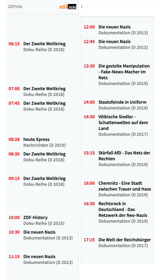 Also zwar ein „ganz normaler Tag“, aber normal in dem Sinne, dass bei ZDFInfo Programmschwerpunkte „programmiert werden“ und zwar am 2. November explizit rund um eine spezielle und aufwendige Produktion zum Rechtsrock, die zur Primetime um 20:15 Uhr ausgestrahlt wurde und dann von weiteren Dokumentationen, die sich ebenfalls mit Rechten und Rechtsradikalismus in Deutschland befassen, gerahmt wurde. Ein Thementag, der dann in voller Länge gleich noch mal am 07.11.2019 (Screenprint s.u.) wiederholt wird, am Morgen mit dem Zweiten Weltkrieg startet, am Vormittag und Mittag dann vier Folgen „Die neuen Nazis“, weiter mit „Die gezielte Manipulation – Fake-News-Macher im Netz“ und „Staatsfeinde in Uniform“ bis das Programm s.o. vom Thementag 02.11. wiederholt wird.