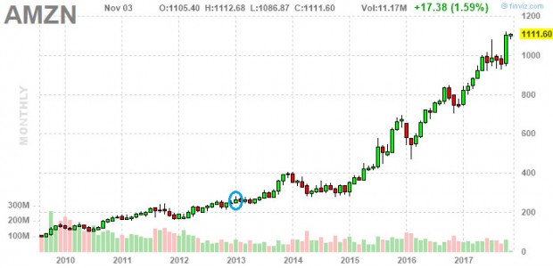 Und jetzt zeige ich Ihnen mit Dank an Finviz für das Chart mal den Kursverlauf von Amazon bis heute, den Januar 2013 habe ich mit einem blauen Kreis markiert. Nun dürfen Sie schlucken: