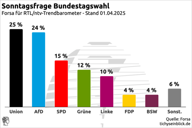 Merz will Kanzler werden. Dafür räumt er jede Position der Union ab und wirft sie die SPD zum Fraß vor. Schuldenbremse, Heizungsgesetz, Migrationspolitik, Geldströme für Vorfeldorganisationen von SPD/Grün. Schaun wir auf die „Sonntagsfragen“ jetzt, nach Abschluß der Koalitionsverhandlungen und dann der Kanzlerwahl. Stabilisiert sich Merz oder schmiert er weiter ab? Durch seine Brandmauerstrategie hat er sich in eine Falle manövriert, die zu verlassen, ihm die Kraft und der Wille fehlt. Sein Nachfolger, der ihn schneller ablösen kann, als Merz momentan denkt, wird diese Arbeit zu leisten haben oder die Union ist nichts anderes als trauriges Anhängsel von rot und grün und beliebig erpressbar.