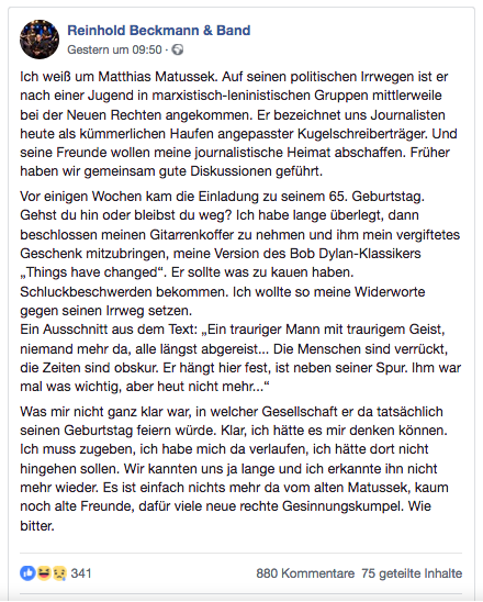 Was mir nicht ganz klar war, in welcher Gesellschaft er da tatsächlich seinen Geburtstag feiern würde. Klar, ich hätte es mir denken können. Ich muss zugeben, ich habe mich da verlaufen, ich hätte dort nicht hingehen sollen. Wir kannten uns ja lange und ich erkannte ihn nicht mehr wieder. Es ist einfach nichts mehr da vom alten Matussek, kaum noch alte Freunde, dafür viele neue rechte Gesinnungskumpel. Wie bitter.“