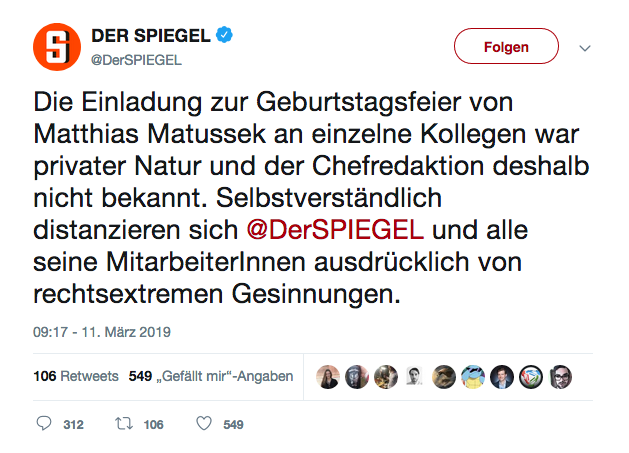Als am nächsten Tag die Fotos von der Feier auf dem Facebook-Account des Jubilars erschienen, entdeckten Aktivisten der Antifa Halle sehr schnell einen jungen Mann namens Mario Müller unter den Gästen, den Matthias Matussek „meinen identitären Freund“ genannt hatte. Müller war tatsächlich einmal dafür verurteilt worden, einen Antifa-Aktivisten in Halle verletzt zu haben. Diese Vorlage wiederum übernahm das Kommando Jan Böhmermann, um offiziell bei SPIEGEL anzufragen, ob die drei Redakteure des Magazins mit Wissen und Erlaubnis der Chefredaktion anwesend waren.