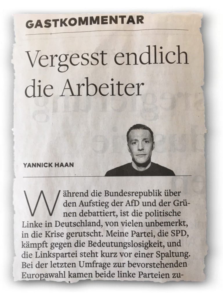 Yannick Haan gehört zu den Sozialdemokraten mit Zukunft. Er sitzt der SPD Alexanderplatz vor, ist stellvertretender Vorsitzender der SPD Berlin Mitte, wirkt in der „Netz- und Medienpolitischen Kommission” des SPD-Parteivorstandes, arbeitet bei der Stadtverwaltung Wolfsburg als “Smart City Manager”, und weiß außerdem, da er auch über die Fähigkeiten eines Smart Social Democrat-Managers verfügt, wie seine Partei noch zu retten ist. In der „Welt“ vom 1. Februar fordert er in einem Meinungsbeitrag: „Vergesst endlich die Arbeiter“.