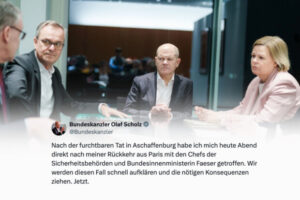 Diesmal Aschaffenburg. Ein Afghane geht mit dem Messer auf kleine Kinder los, um sie zu ermorden. Ein Passant, der das verhindern will, wird erstochen, ein kleiner Junge ebenfalls. Politiker wie Olaf Scholz und Annalena Baerbock, wie Robert Habeck und Nancy Faeser, die die politische Verantwortung tragen für den Zerfall der inneren Sicherheit, überbieten sich mit Betroffenheit. Darauf folgen entschlossen klingende Forderungen, die diese Politiker schon im Moment, da sie diese aussprechen, wieder bis zum nächsten Terroranschlag vergessen haben. Und der kommt gewisser als das Amen in der Kirche.