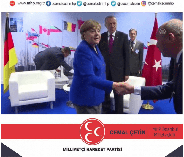 Die Bilder von Merkel mit Erdogan im Hintergrund und dem händeschütteltenden Cetin im Vordergrund waren jedenfalls ofenbar so wertvoll, dass diese von der MHP mit einem Siegel „Cemal Cetin MHP Istanbul Milletvekili“ und den drei Halbmonden (Üc Hilal) weiterverbreitet wurden. Die drei Halbmonde auf rotem Grund stehen nicht nur für das MHP-Parteilogo, der Mutterorganisation der Grauen Wölfe. Sondern für das Osmanische Reich. Alparslan selbst nannte es im Bezug der drei Halbmonden „Osmanische System“ – Eine Kanzlerin, die sich durch Bilder instrumentalisieren lässt.