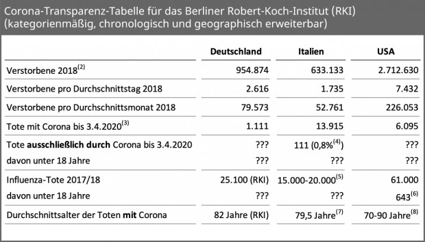 Vielleicht könnte man deshalb das RKI zur Übernahme dieser Arbeit gewinnen. Niemanden muss man dafür vom Schreibtisch weglotsen. Es geht um eine einfache Transparenz-Tabelle. Durch schnellen Vergleich mit Standard-Sterbezahlen und den Todeszahlen anderer viraler Atemwegserkrankungen kann man sein persönliches Risiko immerhin grob überschlagen. Ein solcher Überblick erleichtert überdies eine Abwägung der Angemessenheit der ökonomischen Blockade- Maßnahmen von 2020, die es etwa 2018 ja nicht gegeben hat.