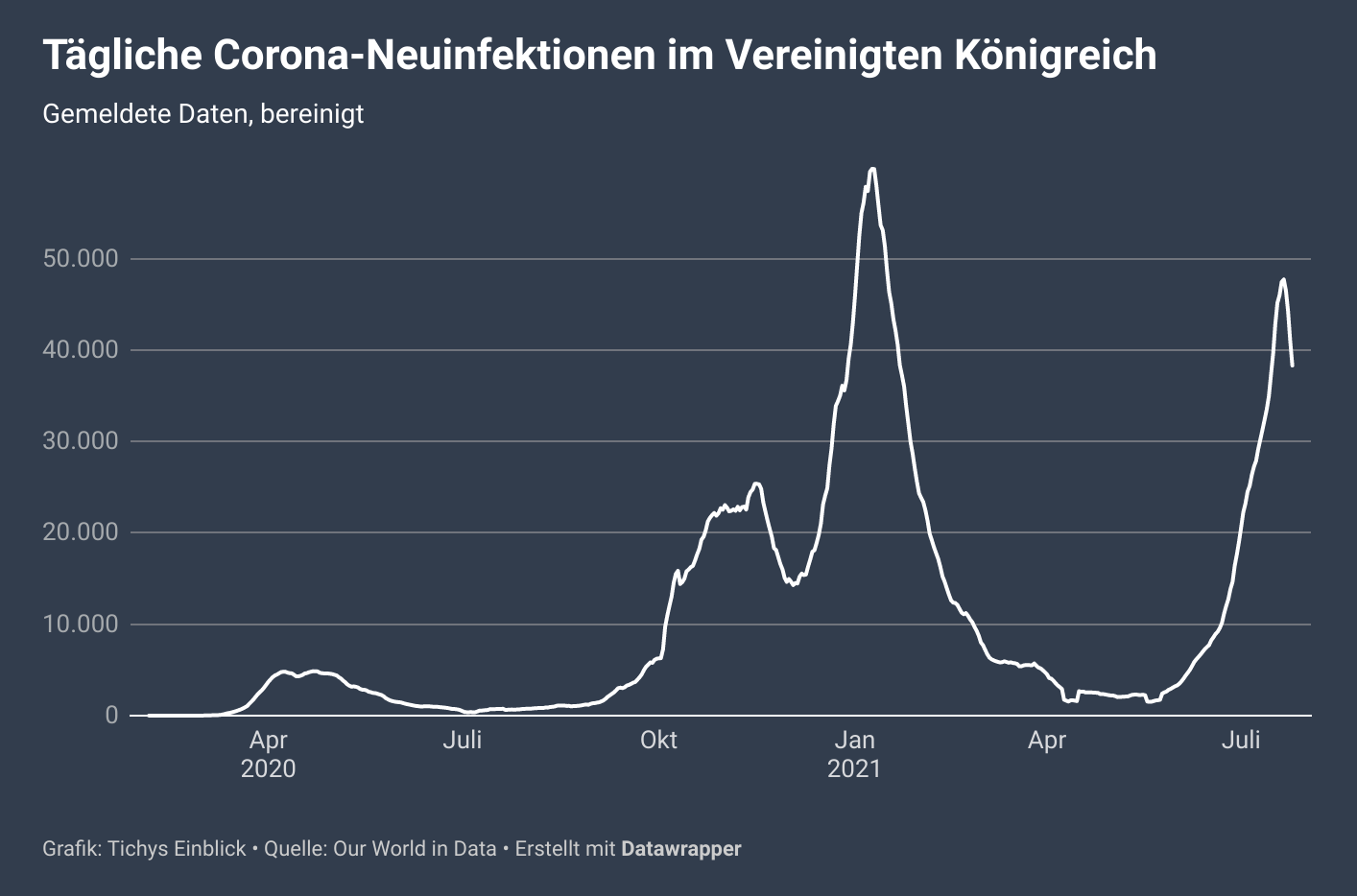 Die Entwicklung im Vereinigten Königreich bietet aktuell eine hervorragende Möglichkeit für die deutsche Coronapolitik: Denn man kann dort jetzt sehen, was wahrscheinlich auf uns zukommen wird. Auf der anderen Seite des Ärmelkanals ist man gerade voll in der „Delta-Welle“, die in Deutschland aller Voraussicht nach auch bald eintreffen wird.