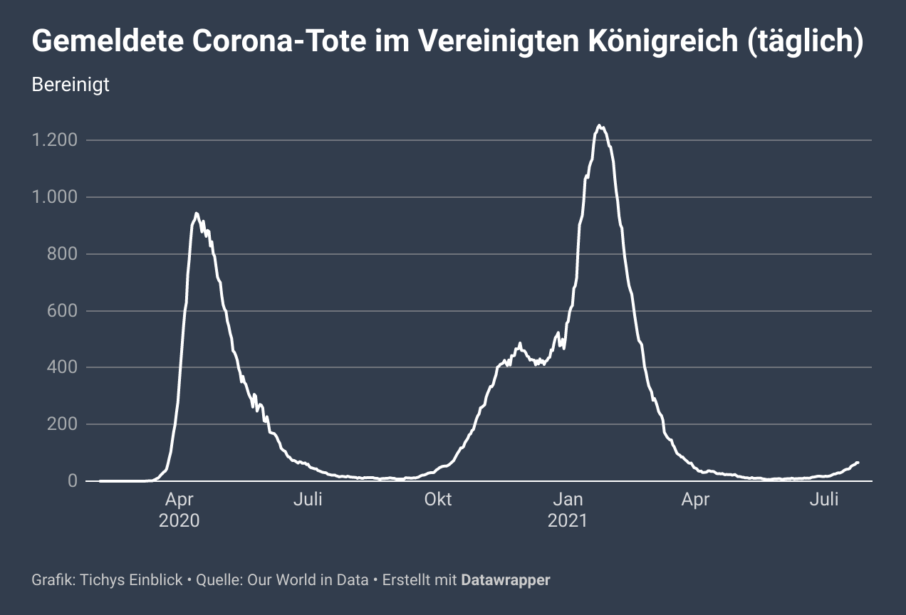 Normalerweise sollten die niedrigen Todeszahlen in UK bei Delta ein Zeichen der Entwarnung sein, stattdessen aber erhöhen BRD-Politiker hier immer mehr den Druck. BRD-Mainstreammedien berichten überhaupt nicht über die erfreulichen Zahlen aus UK. Mir gibt das schon zu denken: Warum werden die Zahlen aus UK in der BRD von den Staatspropagandamedien verschwiegen und der Bevölkerung hier vorenthalten ? Mit den Zahlen aus UK und den wenigen Toten könnte man doch die Bevölkerung beruhigen. Es passiert aber genau das Gegenteil und es wird in der BRD immer mehr die Panik geschürt und Millionen Menschen werden in Angst versetzt.