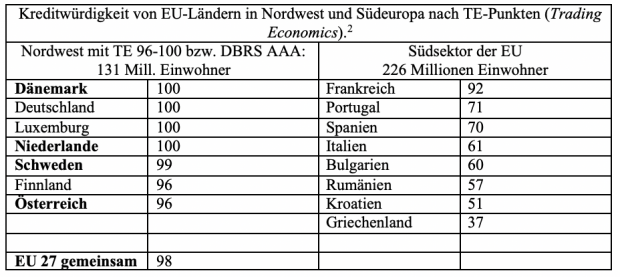 Schaut man jedoch genauer hin, dann geht es um vier von lediglich sieben EU-Staaten, die auch auf eigenen Füßen ein Triple-A bzw. 96 bis 100 TE-Punkte schaffen. Und es sind lediglich die sieben Triple A-Staaten mit ihren insgesamt 131 Millionen Einwohnern, die der EU eine Bonität von 98 TE-Punkten bescheren. Ohne sie tendiert der verbleibende Block aus 20 Staaten mit insgesamt 315 Millionen Einwohnern zu 70 TE-Punkten, wo man sich etwa mit Malaysia träfe. Man müsste darum kämpfen, um BBB bzw. 65 TE-Punkte auf Abstand zu halten, bei denen Probleme der Kreditbeschaffung hoch akut werden. Zwei 50er zusammen ergeben ja keinen 100er, sondern ein Fiasko. Selbst Frankreich hat seine 92 Punkte wahrscheinlich nur aufgrund der Zahlachse Berlin-Paris, auf die man sich bei den Agenturen verlässt.