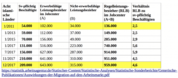 2011 war die Anzahl der muslimischen erwerbsfähigen Leistungsbezieher fast doppelt so hoch wie die sozialversicherten Beschäftigten. 2017 war die Menge der Leistungsbezieher schon mehr als dreimal so hoch.