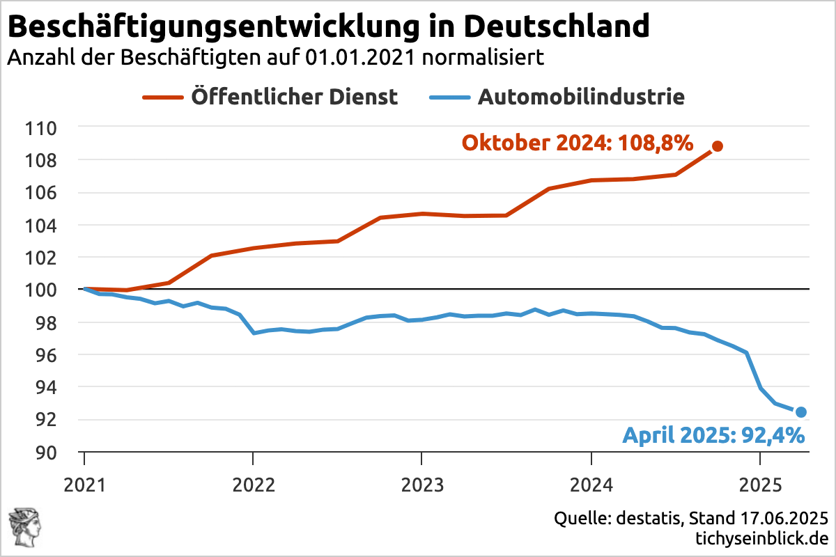 Ihrer Graphik entnehme ich die politische Verantwortung der Regierung. Die entlassenen Fachkräfte der Automobilbranche werden einfach im öffentlichen Dienst übernommen. Eine sogenannte win – win – win Situation: Keine Arbeitslosen, die Steuerzahler bleiben erhalten und keine negativen Demonstrierende.