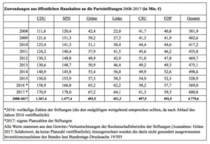 Im vergangenen Jahr 2017 stand vor allem die Heinrich-Böll-Stiftung der Grünen im Kreuzfeuer der Kritik. Sie nutzte das üppig fließende Steuergeld unter anderem dazu, um ein bezeichnender Weise „Agent*In“ genanntes Internetportal zur Anprangerung und Diskreditierung politischer Gegner aufzubauen (Näheres siehe hier). Das Portal wurde zwischenzeitlich aufgrund des öffentlichen Drucks vom Netz genommen. Auch die Friedrich-Naumann-Stiftung der FDP war 2017 in die Kritik geraten, weil sie mit kostspieligen Magazinbeilagen vor den Landtagswahlen 2017 Werbung für die FDP gemacht habe, was als unerlaubte verdeckte Parteienfinanzierung zu werten sei (siehe hier). Schon im Jahre 2012 waren dubiose Firmentransaktionen zwischen der FDP und einer Tochterfirma der Friedrich-Naumann-Stiftung bekannt geworden, die der FDP hohen Gewinn bescherten und den Verdacht der unzulässigen Parteienfinanzierung hervorriefen (siehe hier).