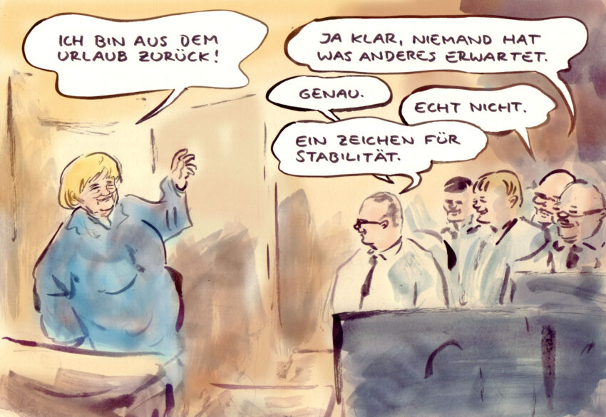 Ihre „Hausaufgaben“ hat sie jedenfalls immer brav gemacht, erfährt man: „Dafür arbeite ich. – Daran arbeite ich. – Dafür muss ich noch viel arbeiten. – Ich muss natürlich auch in Europa arbeiten. – Alle dürfen wissen, dass ich mit aller Kraft, die ich habe, daran arbeite. – Wir müssen weiter arbeiten“, so heißt es nach fast jedem dritten Satz. Für meine Ohren klingt das bald schon nach einer grässlichen Schufterei in einem endlos sich drehenden Hamsterrad.