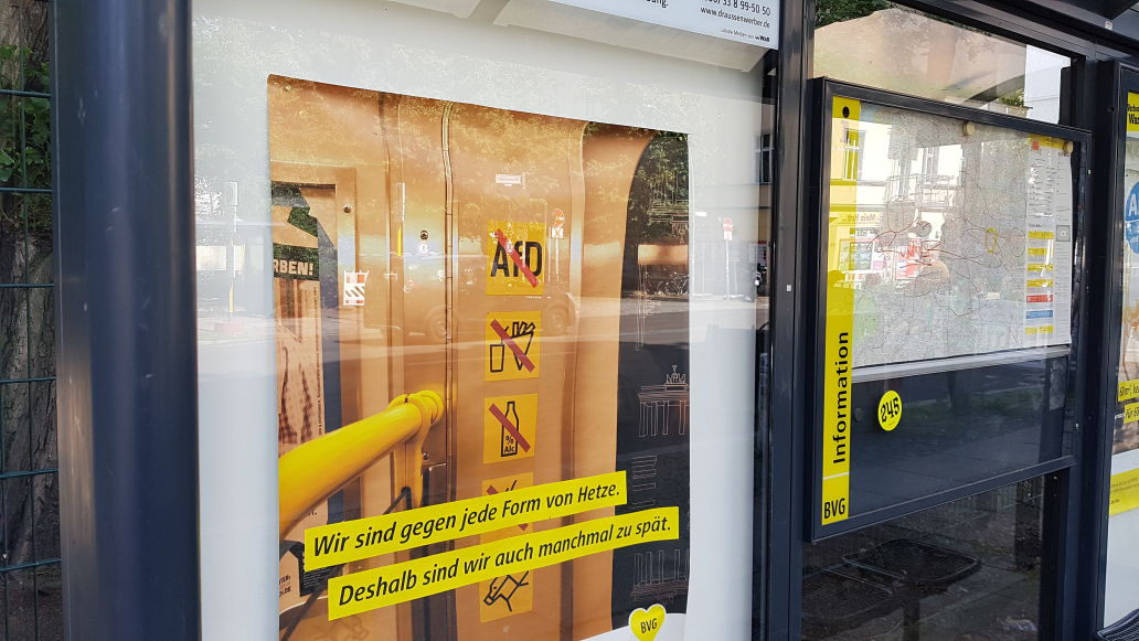 Kein Zutritt für AfD-Anhänger – Plakat in einer Berliner Bushaltestelle, laut BVG eine Fälschung