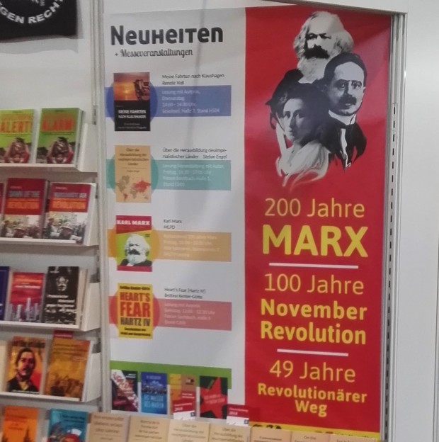 Mit einer absoluten Selbstverständlichkeit trugen unübersehbar viele Besucher eine Karl Marx Tasche über der Schulter. Ohne jedes schlechte Gewissen, nicht mal einem schlechten Gedanken oder einer wenigstens kritischen Überlegung dabei. Die Auferstehung des Heiligen Vaters aller Roten war auf der Messe nicht zu übersehen. Titel: „Grüß Gott. Da bin ich wieder.“ Obwohl er der Vater der blutigsten Ideologie aller Zeiten war, ist und bleibt. Ganz egal. In ihrem Weltbild steht er weiterhin für das Gute und jeder, der anders denkt, ist weiterhin ein Böser. Also jemand, gegen den zu kämpfen jedes Mittel Recht ist. Ich hatte unter ihnen, den Linken, oft das Gefühl, dass ich jederzeit ein Auserwählter auf dem Weg zum roten Schafott hätte werden können. Sie schauten mich an, wie eine Laus, die man entsorgen muss. Und, sobald Menschen wie sie wieder das Sagen haben, wäre es auch wieder soweit.