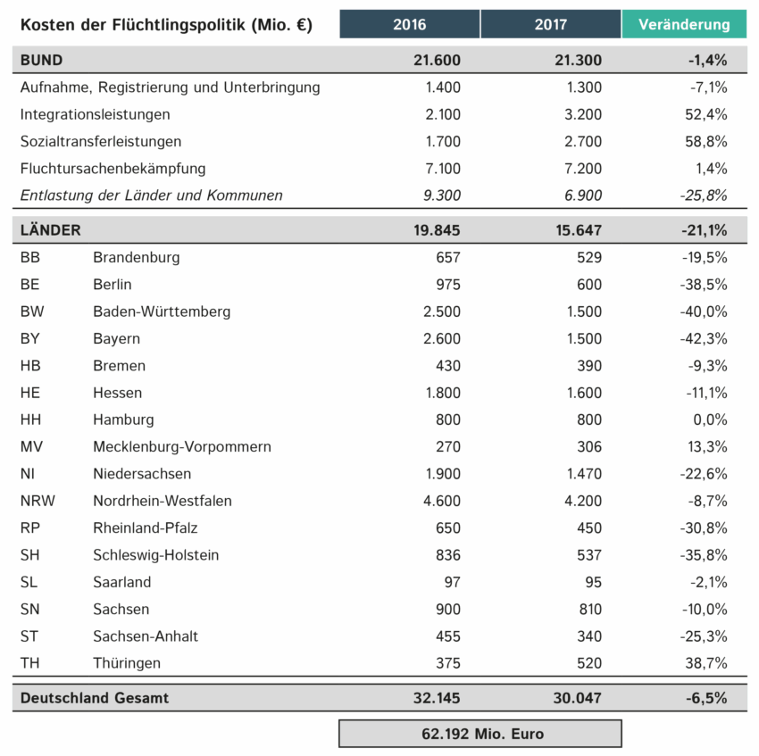 Die Einwanderungspolitik unserer Regierung erzeugt für Deutschland Kosten in Höhe von voraussichtlich mehr als 62 Mrd. Euro für zwei Jahre: die Zahlen für 2016 und 2017 im Check.