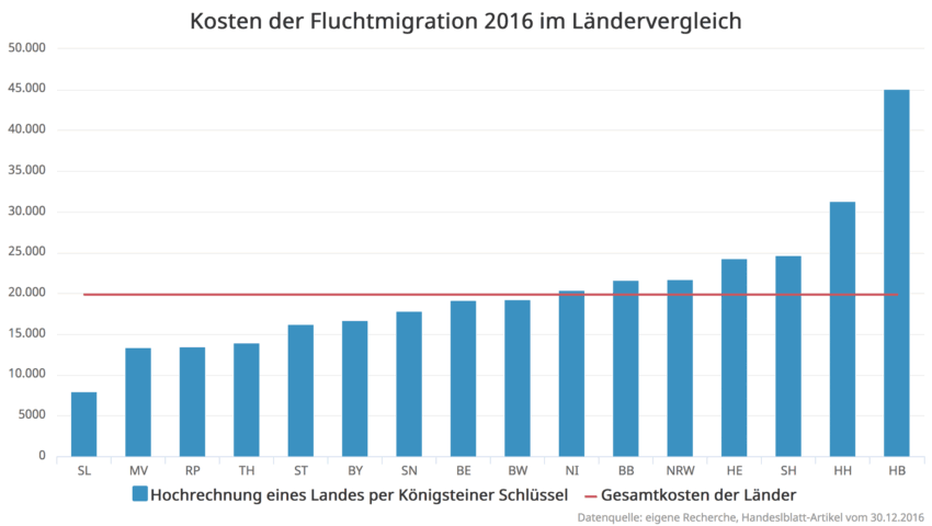 Interessant wird es, wenn man die Kosten eines Bundeslandes mit Hilfe des Königsteiner Schlüssels auf die Gesamtkosten aller 16 Länder hochrechnet (dieser Schlüssel richtet sich nach Steuereinnahmen (2/3 der Bewertung) und Bevölkerungszahl (1/3) und wird für die Verteilung der Flüchtlinge auf die Bundesländer verwendet). Durch diese Berechnung werden die Fluchtmigrationskosten der Länder vergleichbar. Insbesondere die rot-grün regierten Hansestädte Bremen und Hamburg fallen durch deutliche höhere Ausgaben 2016 auf.