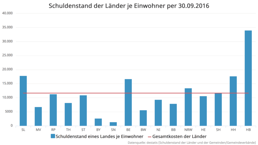 Um die Analyse einen Schritt weiterzubringen werfen wir auch noch einen Blick auf den Schuldenstand der Länder und Kommunen per 30. September 2016.