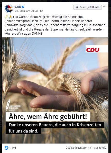 Den Gipfel von Hohn und Spott aber hat die CDU auf Facebook erklommen. „Ähre wem Ähre gebührt“ betitelt sie ein biblisch anmutendes Foto von Getreideähren in geöffneter Bauernhand. Psychologisch ist es klar, was das bedeutet. Die „Ehre“ will oder kann man den Bauern dann doch nicht zugestehen und weicht verschämt auf dieses Wortspiel aus. Nein, nach 20 Jahren der Verunglimpfung und Diffamierung haben die Bauern nichts Gutes mehr zu erwarten. Corona hat es an den Tag gebracht.