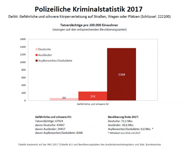 60 von 100.000 Deutschen wurden 2017 als Tatbeteiligte in diesem Deliktbereich ermittelt. Bei den Asylbewerbern waren es 1.368 von 100.000 – also knapp 23 Mal (oder 2.200%) mehr.